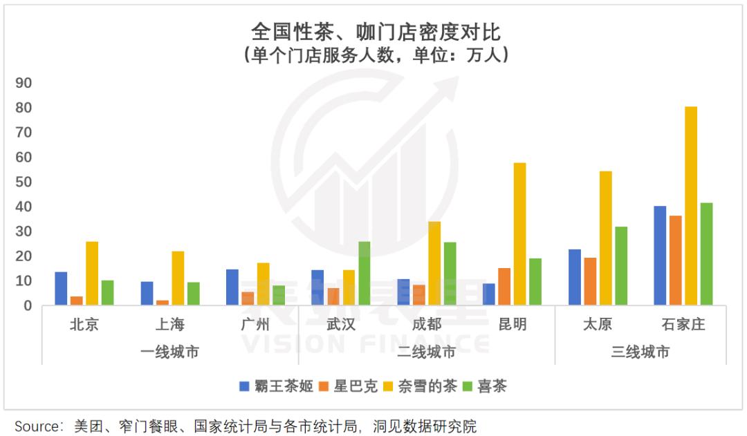 与同行相比,在各线城市,霸王茶姬的门店密度较低,无论是上探还是下沉都有很大的拓展空间。