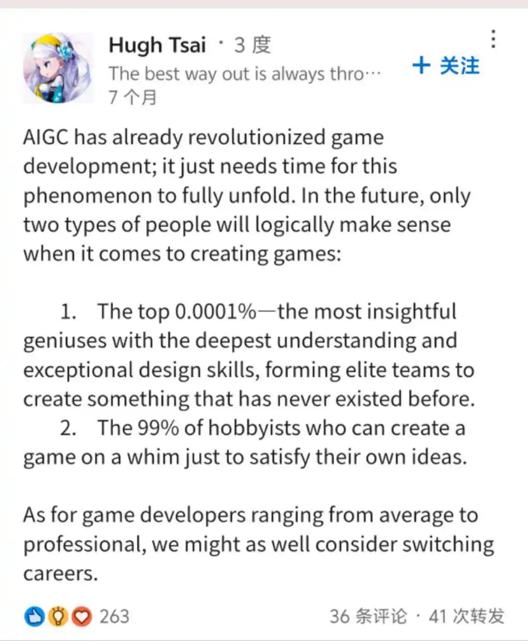 蔡浩宇是AI游戏创业者。(Hugh Tsai)个人观点表达在他的个人领英账号上。他认为,AIGC(人工智能生成内容)给游戏开发带来了革命性的变化,但完全改变这种现象需要时间。在未来,只有两种类型的人在创作游戏时有逻辑意义:第一种类型的人是最有洞察力的天才,他们拥有最深刻的理解和设计理念技能,组成精英团队,创造前所未有的物品。另外,99%的业余爱好者都能心血来潮地创作游戏,只是为了满足自己的想法。