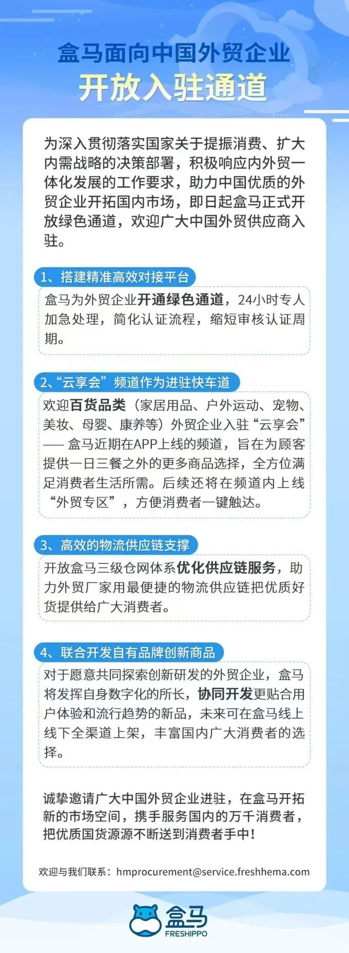 1、搭建精准高效的对接平台。盒马为外贸公司开通绿色通道,24小时专人加急处理,简化认证流程,缩短认证周期。