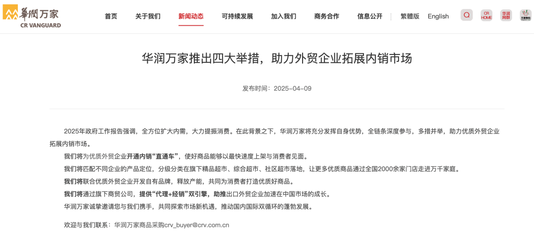 四月九日,华润万家推出四大措施,帮助外贸企业扩大自销市场。