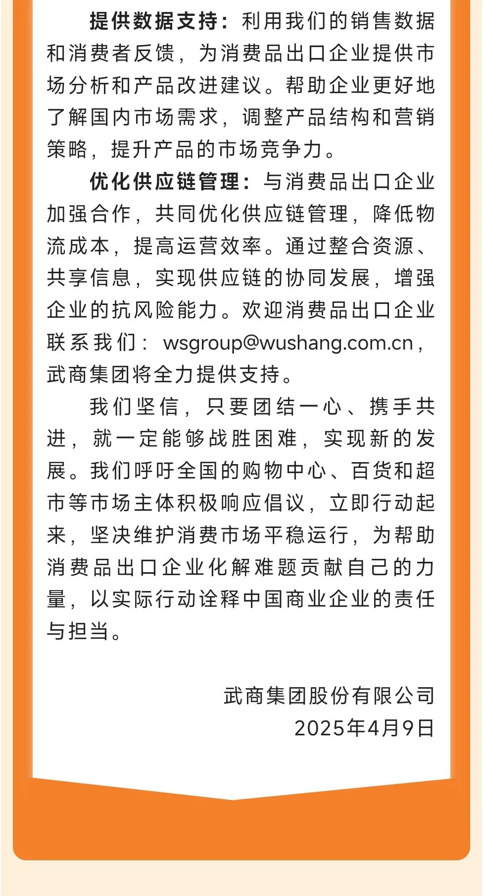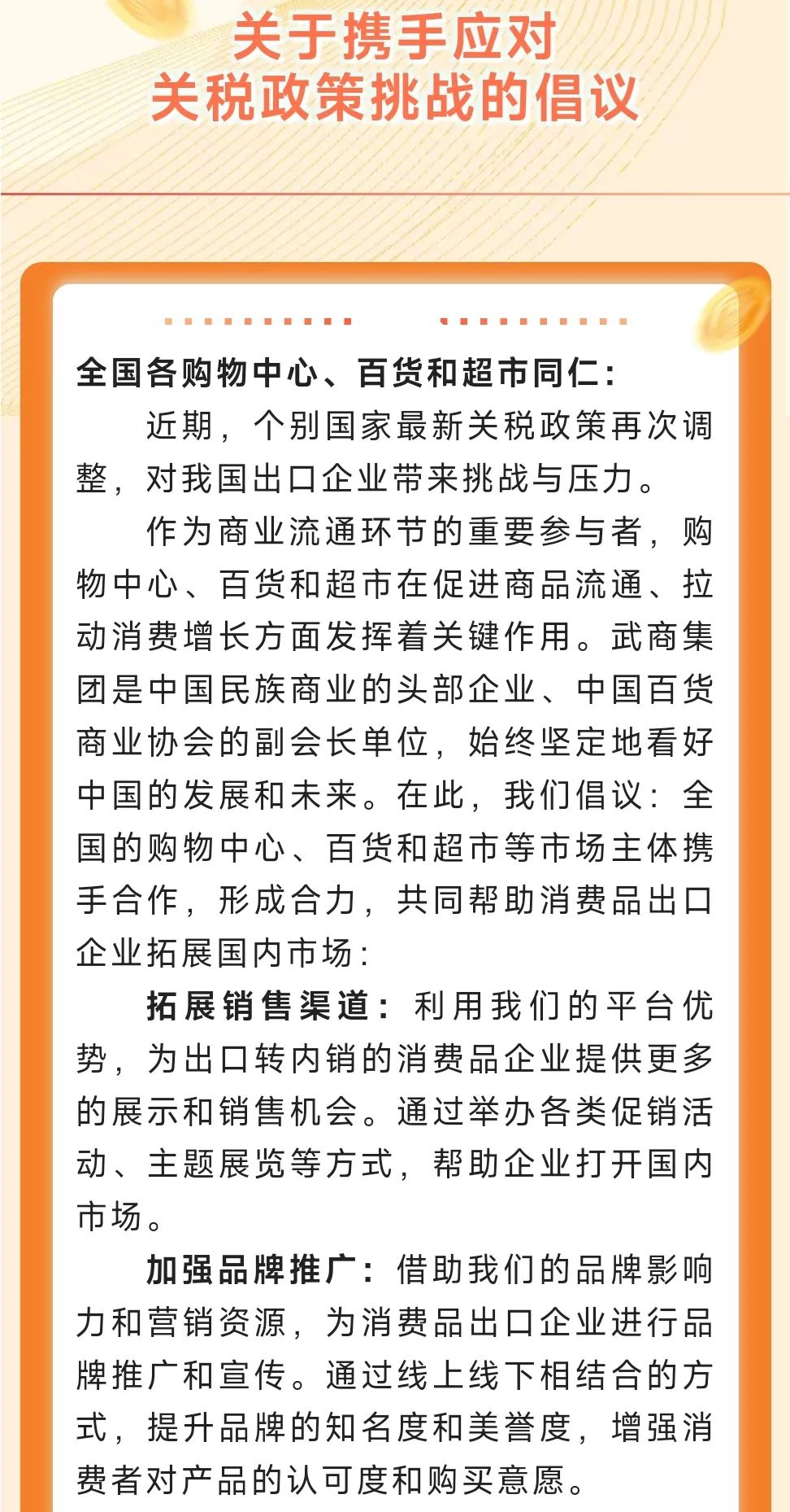 4月10日,武商集团发布倡议,将采取四项措施,帮助消费品出口企业拓展中国市场,呼吁全国各地的购物中心、百货公司、超市等市场主体积极响应倡议,立即采取行动,坚决维护消费市场稳定运行。