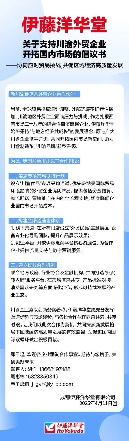 4月11日,伊藤洋华堂发布支持成渝外贸公司开拓国内市场的倡议。伊藤洋华堂作为一家扎根西南市场28年的综合性贸易流通企业,始终坚持“与地方经济共同成长”的发展理念,愿与众多成渝公司携手共进,共同开拓中国市场新领域,帮助成渝制造向成渝品牌转型升级。