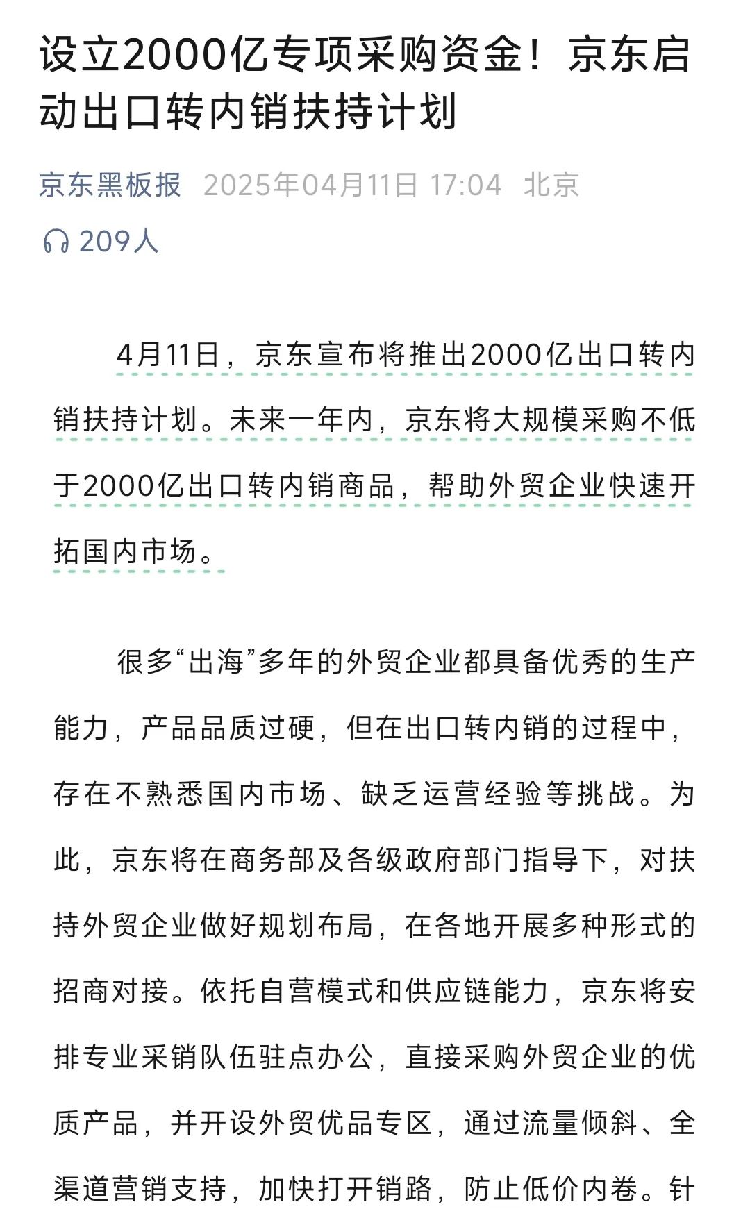 4月11日,JD.COM宣布将推出2000亿出口向国内销售的支持计划。未来一年,JD.COM将大规模采购不少于2000亿出口到国内销售的商品,帮助外贸公司快速开拓中国市场。