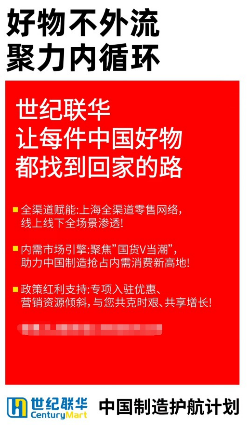 4月9日,上海世纪联华正式宣布启动《中国制造护航计划》,实施“好货不流出”,聚焦内循环,让每一个中国好货都能找到自己的市场。
