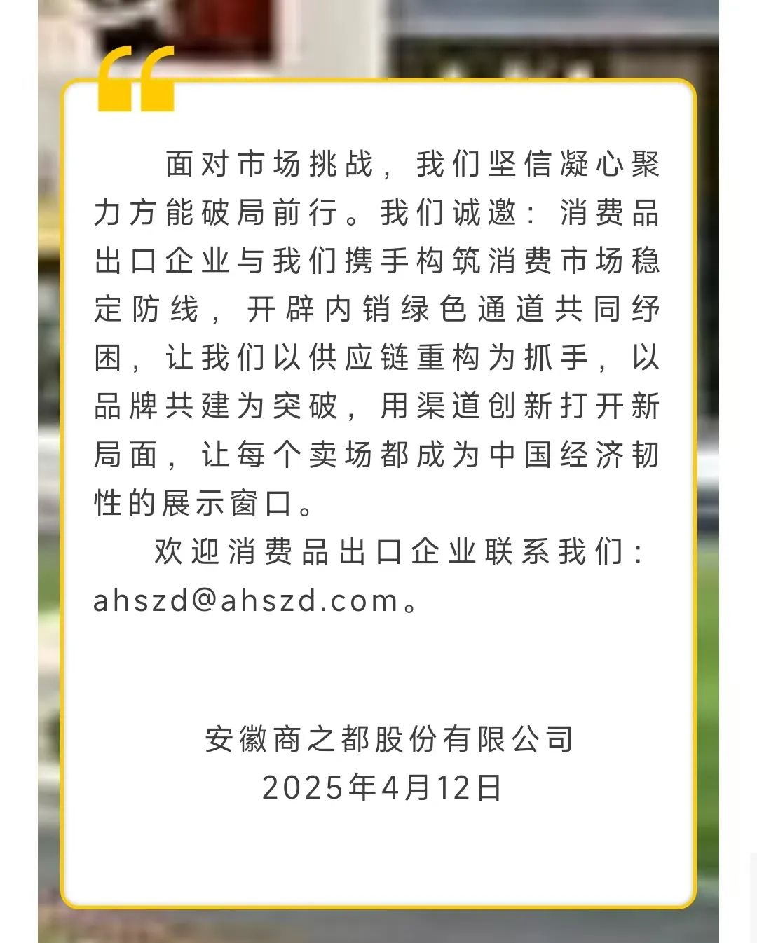 4月12日,安徽商之都发起内外贸易合作邀请,将采取自我销售渠道,开拓本土市场;提高供应链协调,降低企业成本;全球营销赋能,加强品牌推广;数字智力支持、加快品牌优化等措施,深化与外贸消费品出口企业的合作,帮助构建内外贸易“双循环”新发展格局,共同应对关税挑战。