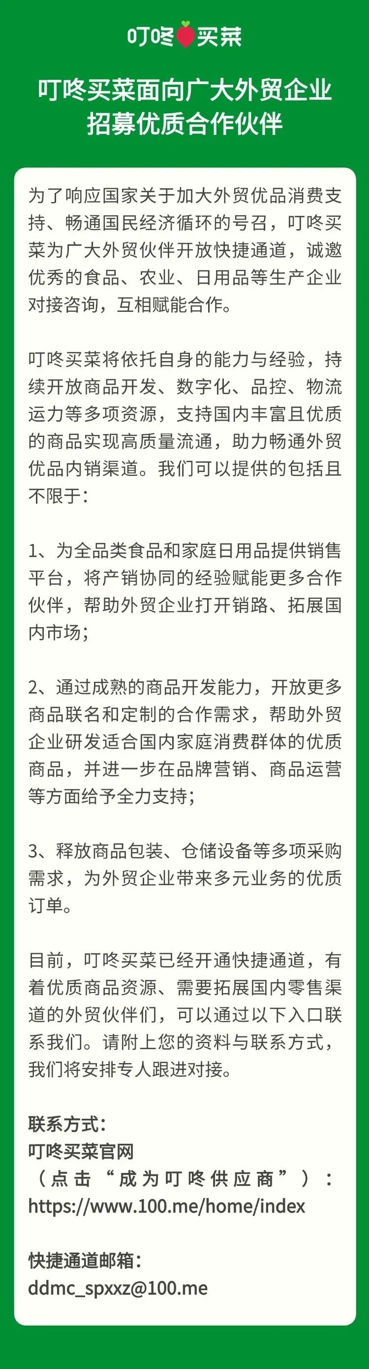 当前,丁咚购物已开通快捷通道,拥有优质商品资源,需要拓展国内零售渠道的外贸合作伙伴可以联系他们。