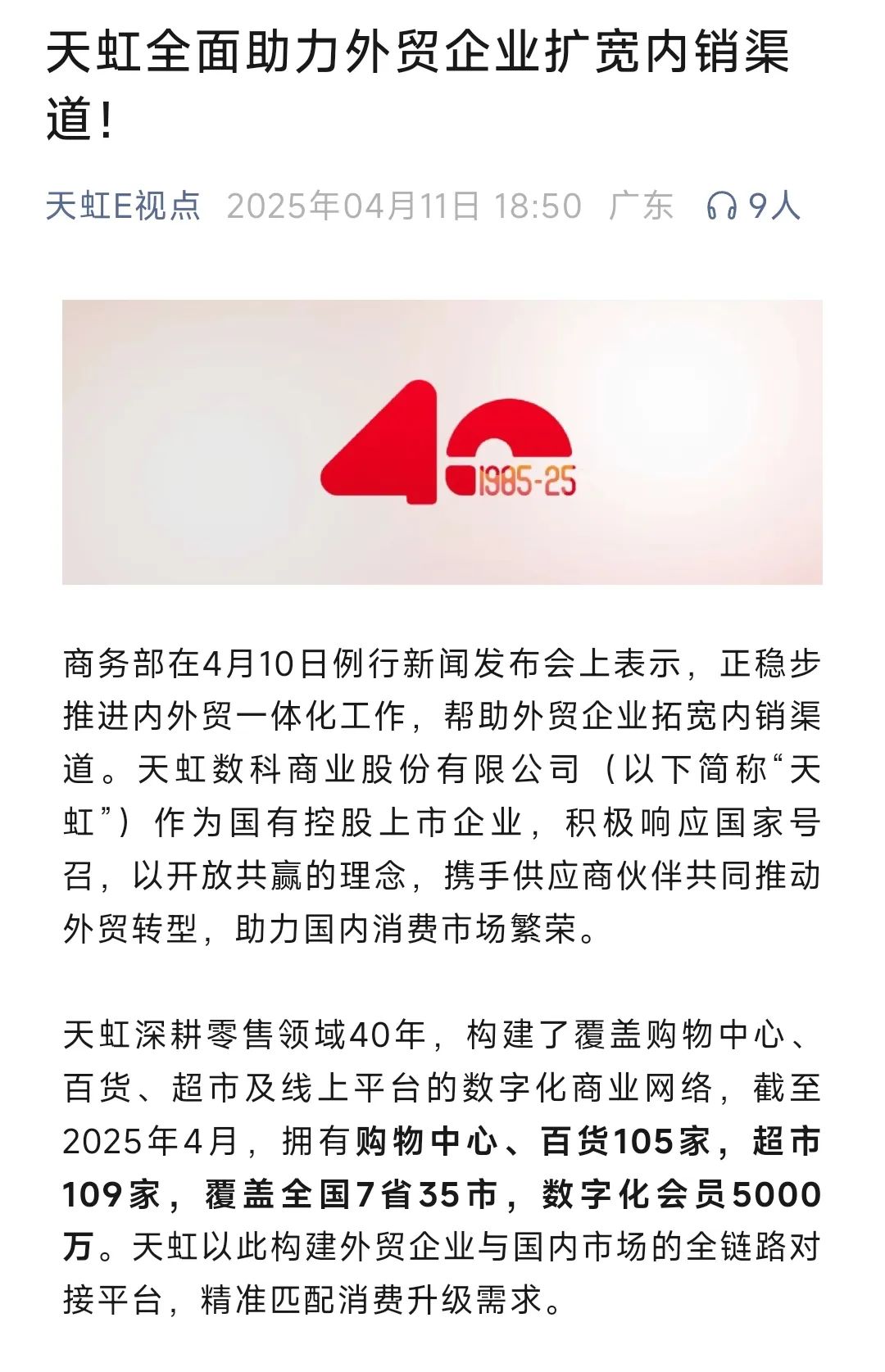 4月11日,天虹发布消息称,将全面帮助外贸公司拓宽自销渠道。天虹作为一家国有控股上市公司,积极响应国家号召,与供应商合作伙伴携手推进外贸转型,以开放共赢的理念,帮助国内消费市场繁荣。