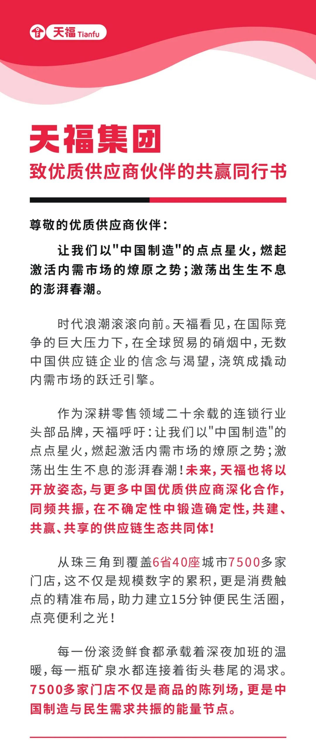 天福还将以开放的姿态,深化与更多中国优质供应商的合作,在不确定性中锻造确定性,成为共创、共赢、共享的供应链生态社区。