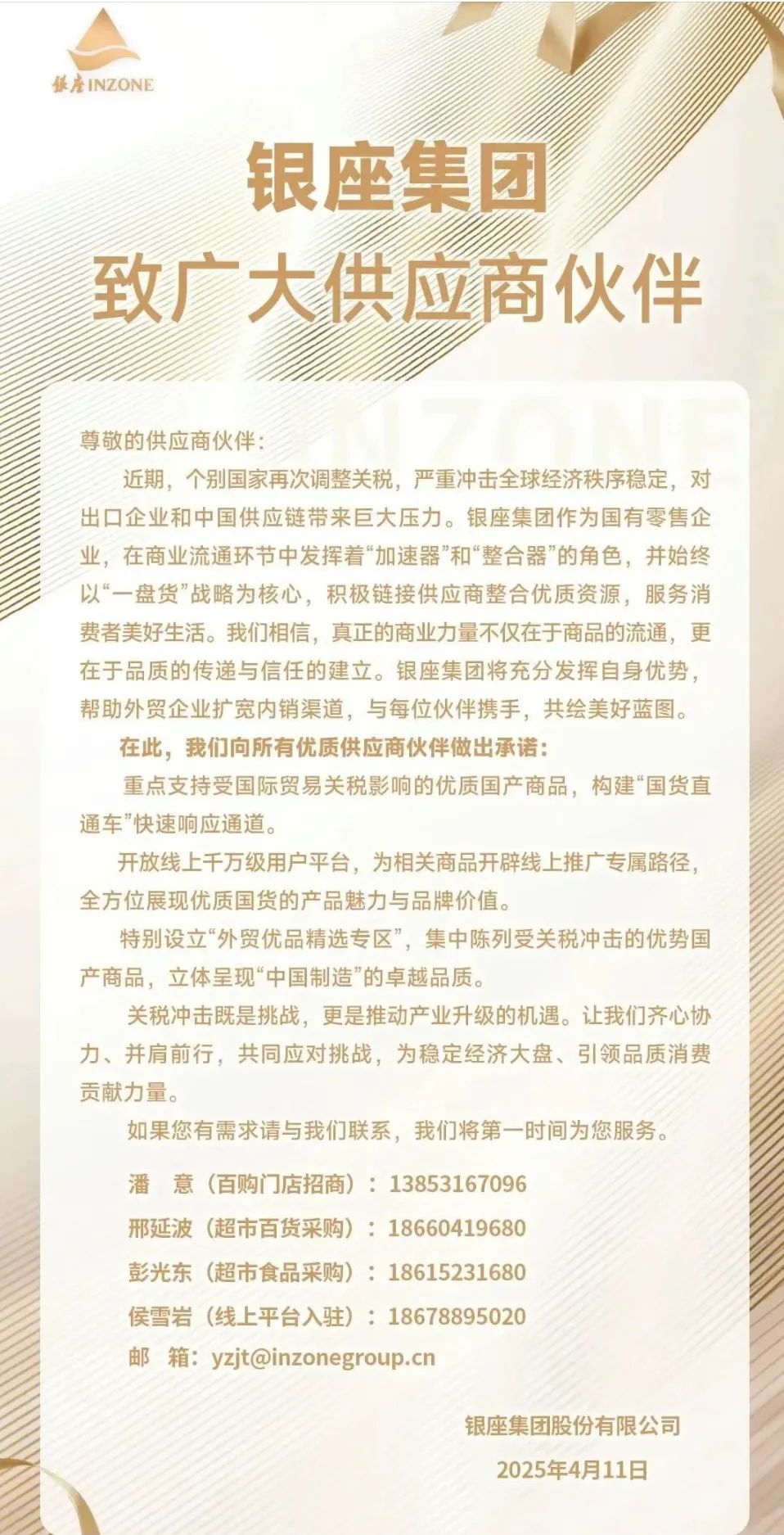 与此同时,银座集团也呼吁供应商合作伙伴齐心协力,并肩前行,共同应对挑战,为稳定经济市场、促进优质消费做出贡献。