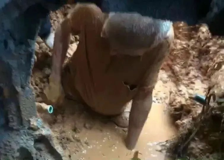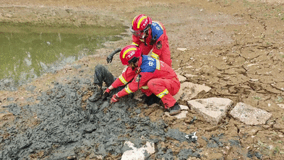 2022年7月2日,北京市门头沟区潭哲寺镇定都阁龙口水库水位塔下废弃泥沙坑。一名男子在水中钓鱼时不小心陷入泥潭,不仅无法自行解困,还有继续陷入泥潭的危险。救援人员跪在泥潭里,双手挖掘,铲子铲子,两个小时后成功救出被困男子。