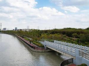 淀浦河是九亭镇滨水绿带的关键道路。河流从西向东穿过九亭,将区域分为南北两部分,形成了“路在风景中,风景在路中”的身临其境的骑行体验。从波光粼粼的河景开始,骑行道平坦宽阔,在牛车泾桥拍摄堤岸全景是一个极好的位置。