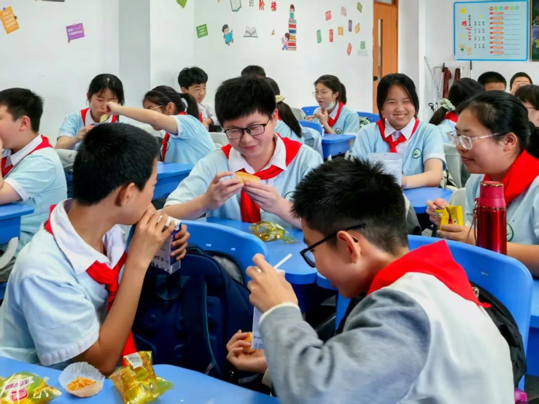 “要不要试试我带的?”“好吃!”.........采访中,记者看到,分享的快乐在高年级学生中依然流行。“孩子毕竟是孩子,幸福都挂在脸上。”在七(5)班班主任董翠菊看来,下午茶不仅可以解决高年级学生的课间能量供应问题,也是学生之间沟通的桥梁。
