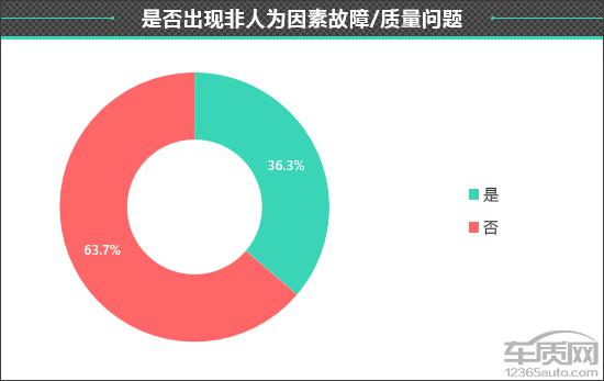 据调查结果显示,正在收到的 102 在有效的问卷中,有 37 一份问卷显示车辆出现了非人为故障或质量问题,比例为 36.3%。