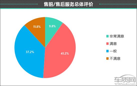 在售前 / 在售后服务的整体评价中,接受调查的车主给出了客观中肯的评价,其中认为“非常满意”的车主比例是 9.8%;感到“满意”的车主比例是 41.2%;认为“一般”的车主比例是 37.2%,还有 11.8% 车主明确表示“不满意”。