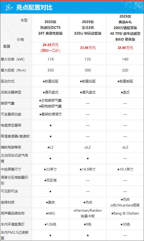 就车辆配置而言,通过对比,虽然三款车型都配备了车辆配置, 2.0T 涡轮增压发动机,但凯迪拉克 CT5 显然,性能参数更为突出。考虑到宝马 3 系和奥迪 A4L 没有配备电磁悬架和限滑差速器。 / 差速锁,所以从理论上讲,凯迪拉克 CT5 性能性能和操纵上限都有较为明显的优势。此外,在一些安全性和技术配置方面,凯迪拉克 CT5 同时也表现出色,包括膝部气囊,语音分区唤起识别,可见即可,均为独家配备。
