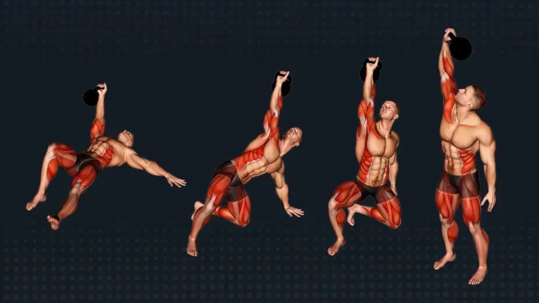 利用暴发力将壶铃放在胸部高度,肘部保持锁定。