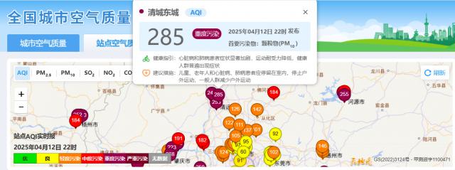 截至 12 日 22 当时,由于沙尘天气的影响,广东部分监测站污染物浓度一度升至严重污染水平。