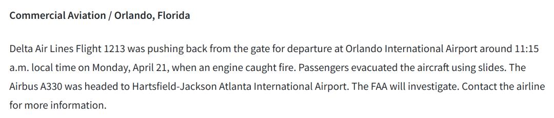 美国联邦航空局(FAA)发表声明称,达美航班原定飞往佐治亚州亚特兰大,美国东部时间早晨。 11 点 15 分左右,当飞机离开登机口时,其中一个发动机着火了。