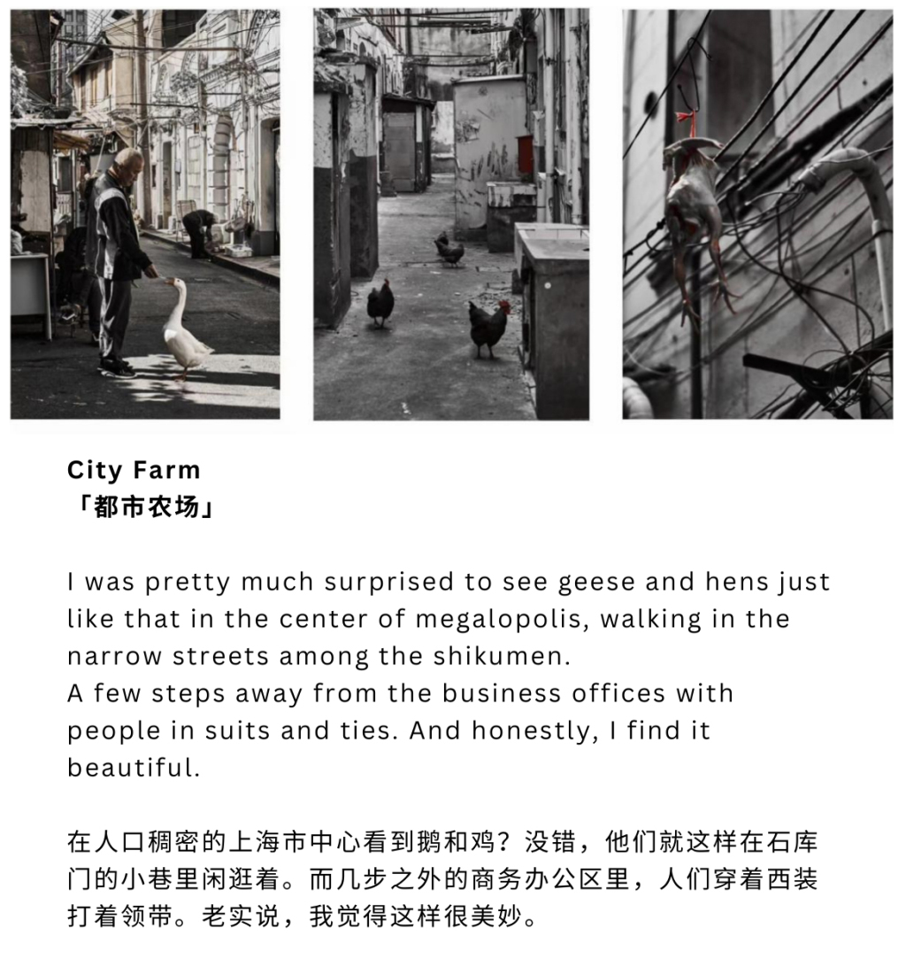 俄罗斯人柴卡(Chaika)她在上海生活了6年多。白天,她在一家公司担任营销经理。业余时间,她穿梭于上海的大街小巷,用自己热爱的摄影和艺术展现了自己不常被国际认可的一面。建筑与巷子时尚华丽⽯库⻔混杂交织,有时还能在巷子里看见鸡鹅,象棋对局…这些照片被她命名为《献给上海的情书》。柴卡是理性的,也是感性的。她没有生活在普通人堆积的照片中——那些甜美的图像带来的幻觉。通过每天走在街上,她越来越渴望了解上海。拍摄帮助她,在俄罗斯人眼里构建了一种中国上海的异国情调。“在INSTAGRAM上,关于上海的照片都是关于外滩的,我觉得这个角度太小了,上海远不止外滩,它非常多样,非常精彩。”在她的照片和由此延伸而产生的文字中,柴卡突出了照片中的红色,有时深,有时浅。他说:“这是中国的颜色,同时,红色代表着‘爱’,代表着我对这个城市的感情。”