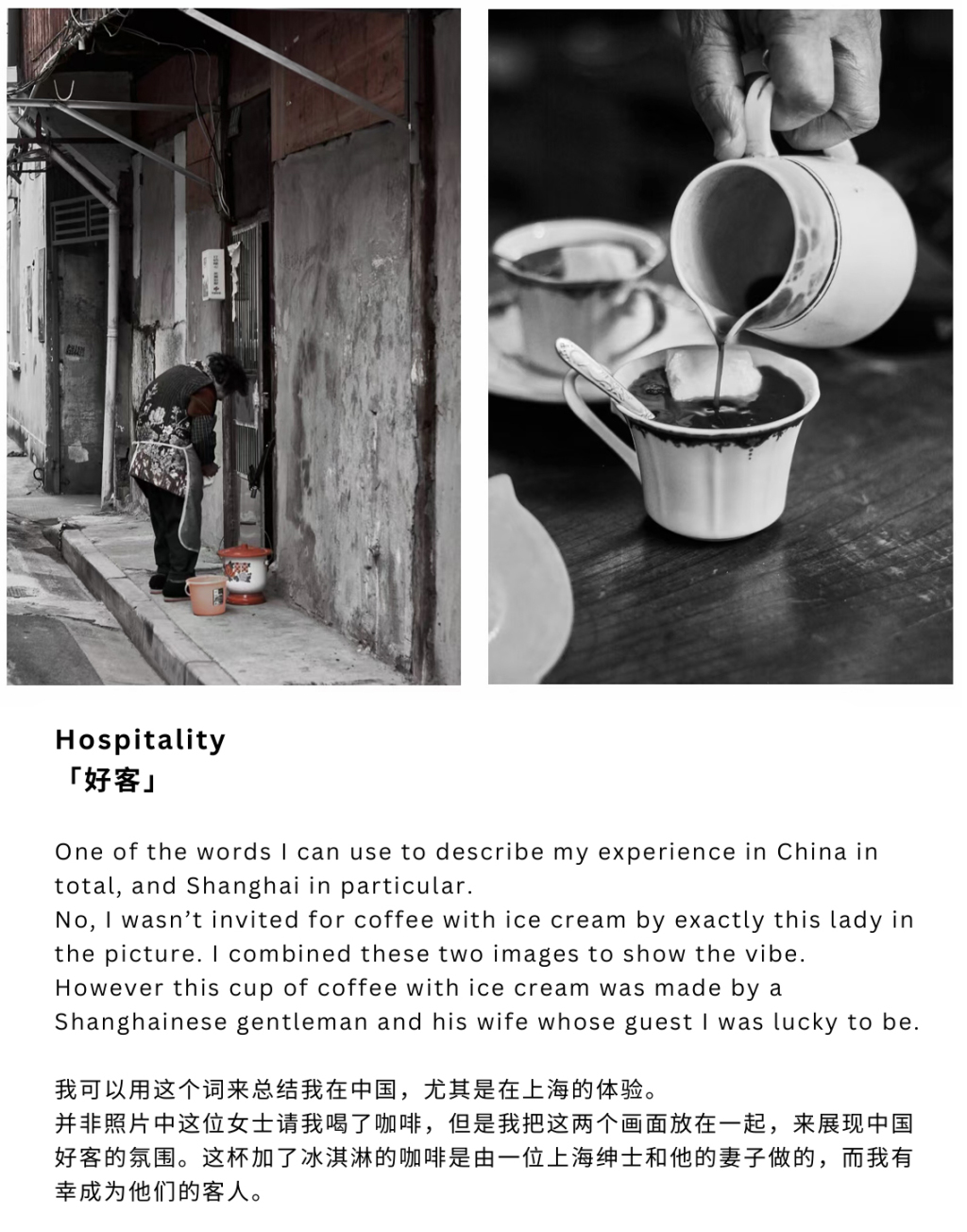 我在上海受到了很多启发。于是,我拍了一组照片,命名为《致上海情书》,因为INSTAGRAM上关于上海的很多照片都是关于外滩的。我觉得这个角度太窄了。上海远不止外滩,而且非常多样化。我想尽我所能展示和描述上海,展示我为什么爱上这座城市。