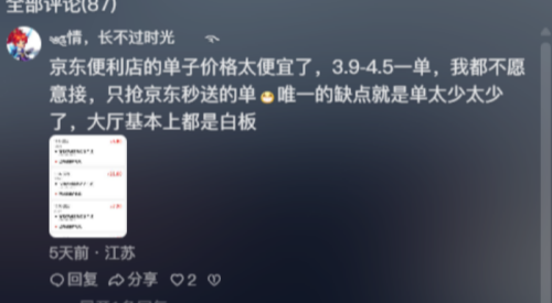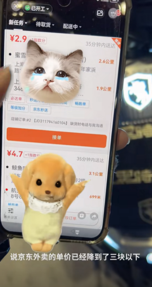 二、未实现接单自由。目前,京东外卖全职骑手并不支持抢单拒单,只能接受系统派单。这意味着,有单没单都得出勤,不管单子好坏都得接,导致不少骑手抱怨经常接到低价单、单子难跑,甚至吐槽是垃圾单,连跑都不想跑了。曾胜也曾在直播中晒出多张低单价的骑手接单截图,比如上海出现2.9元配送单,以及148元、3个多小时、150km的订单,严重打击骑手跑单积极性。