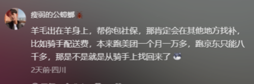在大厂纷纷抵制加班的大背景下,京东作为外卖市场的后起之秀,凭借社保大招赚足了眼球,目前全职骑手已突破1万人,似乎一切都在向好的方向发展。但根据全职骑手现身说法和评论区留言,原来社保光环之外,全职骑手已悄然沦为996牛马,为了将来可能用不上的五险一金,劳动者要牺牲当下的收入和时间自由,代价有点大!