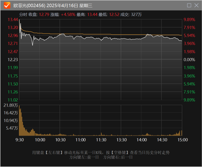 4月16日复牌后,欧菲光股价高开低走。开盘涨幅接近10%,但迅速走低,最终涨幅在收盘时收窄至4.58%。