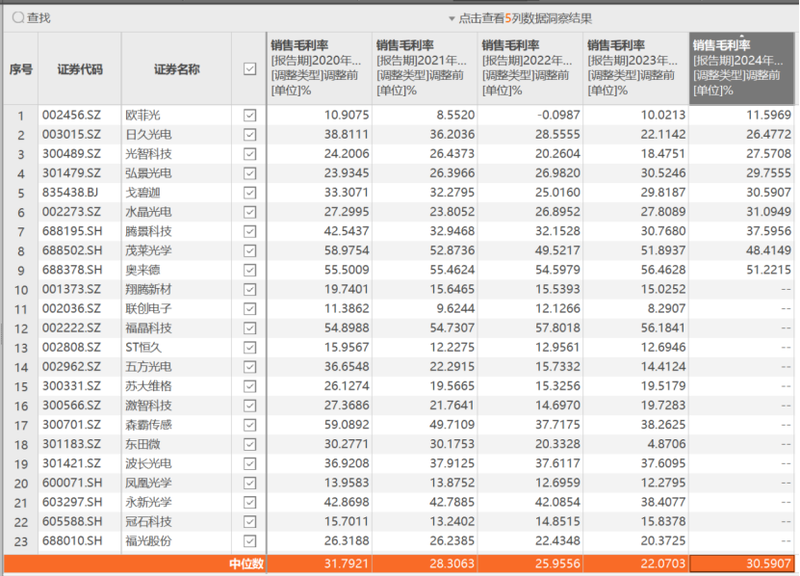 此前,2020-2023年,欧菲光毛利率只有10.9%、8.6%、-0.1%、10%;光学元件板块的中位数则分别为31.8%、28.3%、25.96%、22.1%。