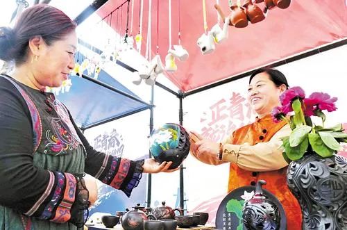 4月8日,在第四届雄安·雄州文化艺术节非物质遗产青年文化创意非物质遗产展区,在雄安新区非物质遗产代表性传承项目黑陶烧制技术展台前,工作人员向游客展示了黑陶作品。记者刘光昱 摄