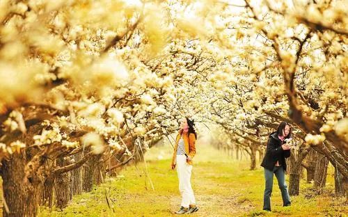 在不远处的花海里,汉服花神和COS盛开,与万亩梨花相得益彰,让游客感受到一场浪漫的春节,仿佛穿越到了古代。许多游客与花神和敖光合影。