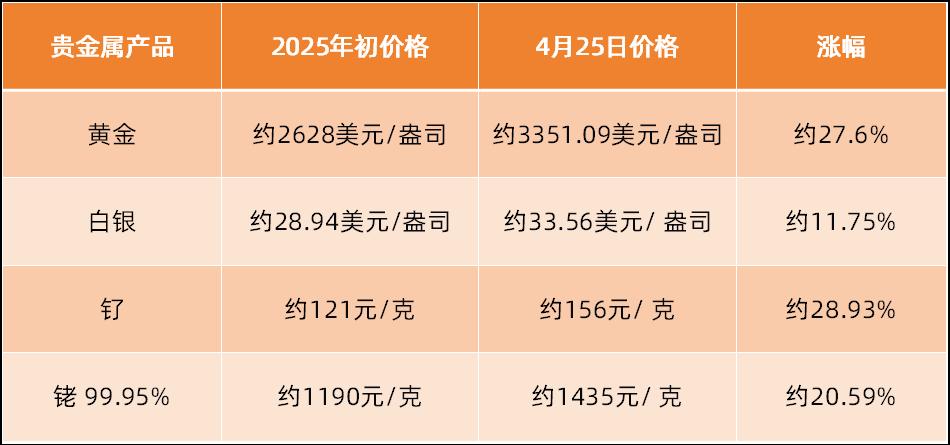 另外,贵金属,如银、邈、钒等也有所上涨。例如,国际现货白银价格从2024年底的28.94美元/盎司上涨到4月25日的33.56美元/盎司,上涨幅度约为u200c11.75%;上涨幅度约为28.93%,上涨幅度约为20.59%。贵金属,如铂、钯、鲟、邈等,价格保持稳定。