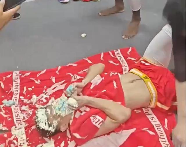 孙铭徽后续很有意识。他知道蛋糕会被砸,所以他第一时间躺在地上,铺上毛巾。当然,孙铭徽并没有被一整块蛋糕砸碎,而是把两块蛋糕砸在了孙铭徽的脸上。他还特意用纸巾捂住鼻子,保护措施还是不错的。