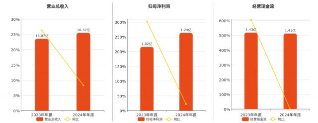 企业总营业收入为 16.32 在已披露的同业公司中,亿元排名第一。 68。归母净利润为 1.24 十亿元。经营活动现金净流入 1.41 在已披露的同业公司中,亿元排名第一。 与去年同期报告期经营活动相比,现金净流入减少 170.83 与去年同期相比,万元有所下降。 1.19%。