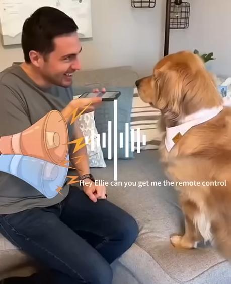 看见主人对手机说:Hey Ellie,can you get me the remote control?(Ellie,你们能帮我拿起控制器吗?),这句话立刻被手机翻译成狗叫。