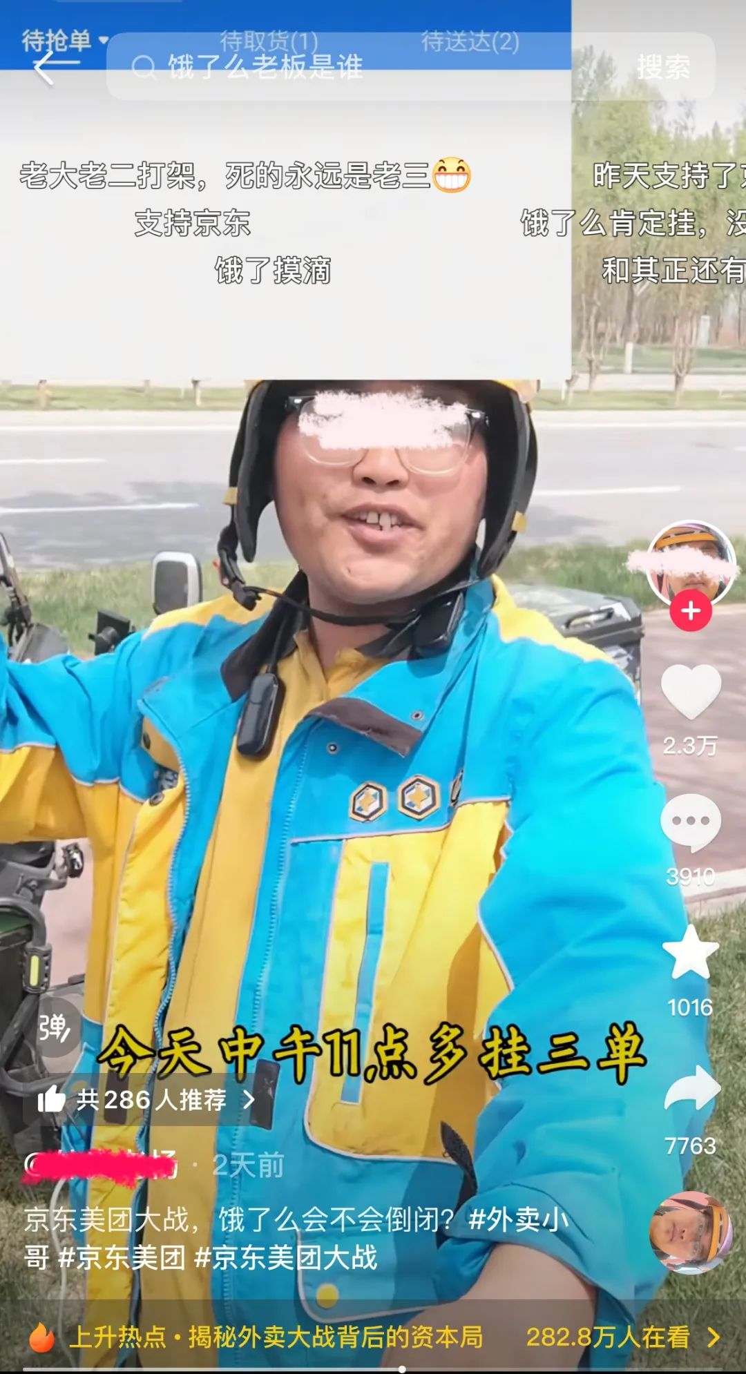 最近有个众包骑手发视频说饿了。也许他说出了饿了么的尴尬局面。“金山对决360的时候,瑞星倒闭了。加多宝对王老吉的战斗正在消失。你想死吗?今天中午挂了三个订单,大厅白板,没有订单。”