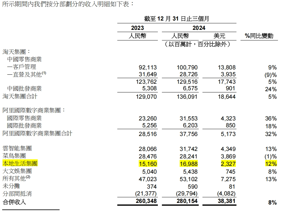 今年二月,阿里巴巴公布了2025财年第三季度(截至2024年12月)财务报告数据,公司总收入达到2801.5亿元,比去年同期增长8%,超过市场预期的2773.7亿元;营业利润为412.05亿元,比去年同期增长83%;其中,当地生活集团收入169.88亿元,包括饿了么和高德,同比增长12%,这主要是由于饿了么和高德订单的增加,以及营销服务收入的增加。