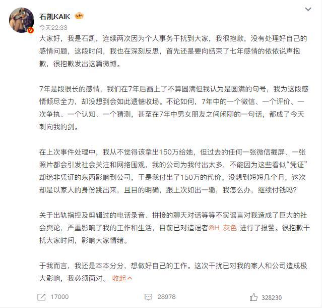 4 月 27 日本,歌星石凯发表了一篇长文,正式回应了最近的舆论风波。此前,微博用户 @H_ 作为当事人的姐姐,灰色 4 月 23 每天发布长文,爆料石凯和化名 "依依" 女人有近七年复杂的情感历程,包括出轨、冷暴力等争议内容。u200b