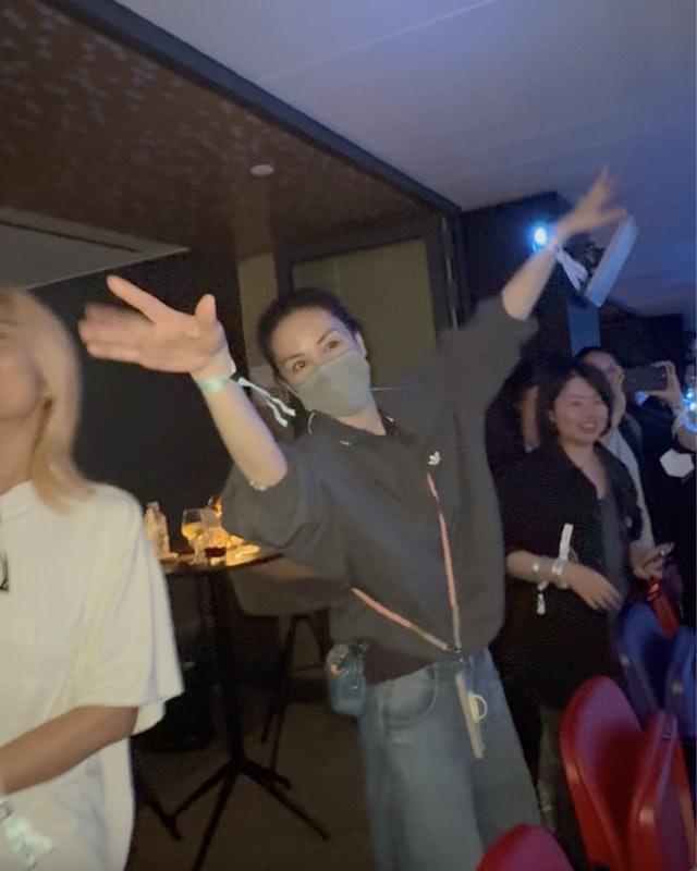 等谢霆锋唱起《玉蝴蝶》时,王菲激动不已,她来到包间的前沿,跟着音乐沉醉起舞。