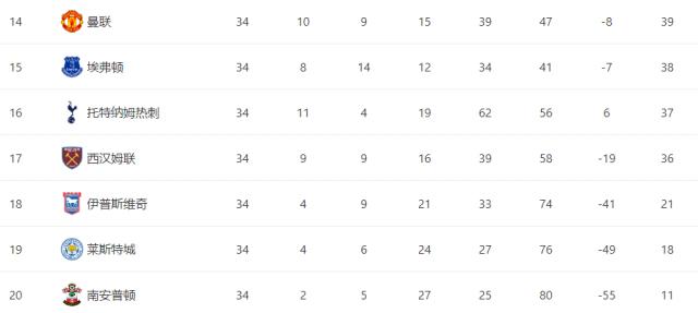 这里的降级区更早地失去了悬念,3 支升班马携手回到英冠赛场;首先,南安普顿提前提前 7 轮换降级,创造英超最快降级时间。接着莱斯特城提前了 5 轮子也挥手告别,这个 2016 一年一度的英超草根冠军 3 年内第 2 第二次降级;而且球队功勋瓦尔迪也将决定在赛季结束后离开王权球场。伊普斯维奇这一轮 0:3 击败纽卡斯尔,匆匆结束英超之旅;这是英超历史上第一次连续第二年出现。 3 支升班马共同降级的现象。