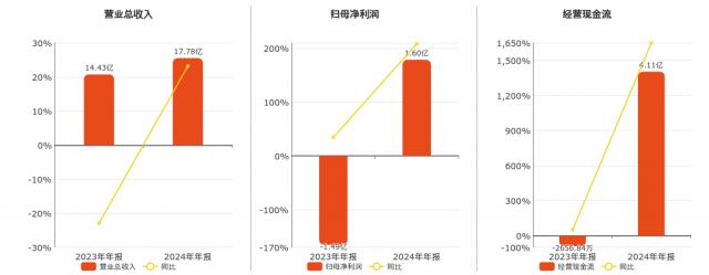 企业总营业收入为 17.78 亿元。归母净利润为 1.60 十亿元。经营活动现金净流入 4.11 亿元。