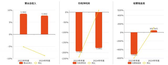 企业总营业收入为 5.09 在已披露的同业公司中,亿元排名第一。 与去年同期报告期的营业总收入相比,123 4923.07 与去年同期相比,万元有所下降。 8.82%的归母净利润 -1.06 在已披露的同业公司中,亿元排名第一。 143。经营活动现金净流入为 955.36 在已披露的同业公司中,万元排名第一。 125。