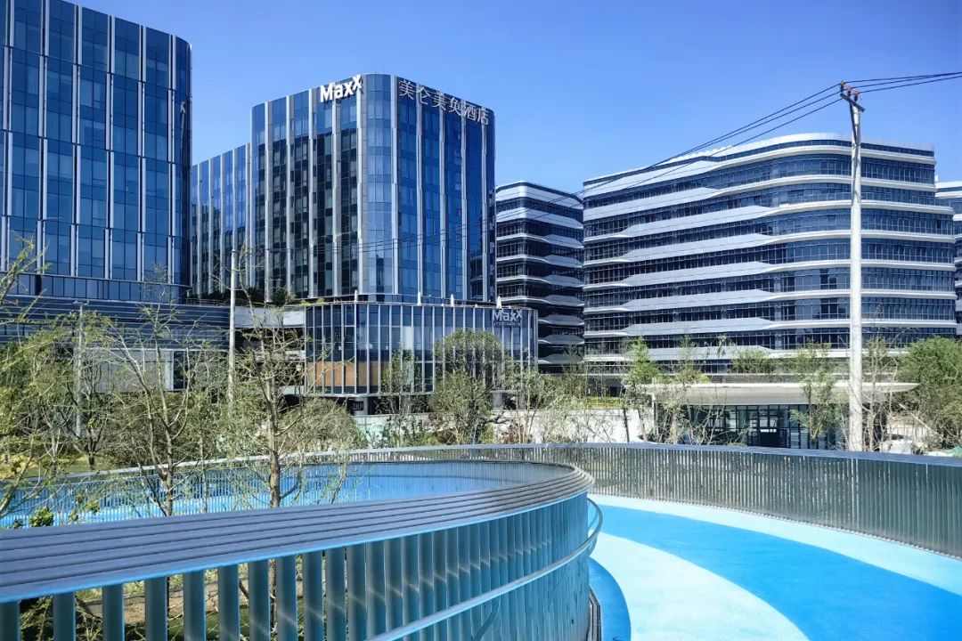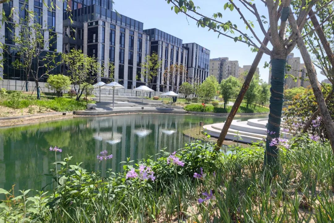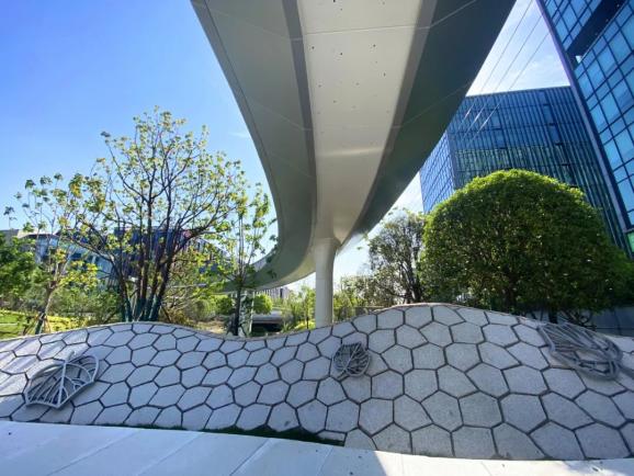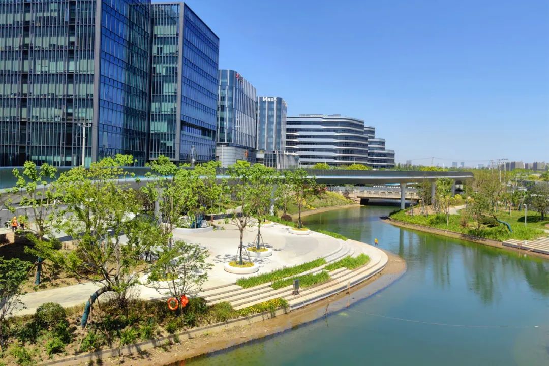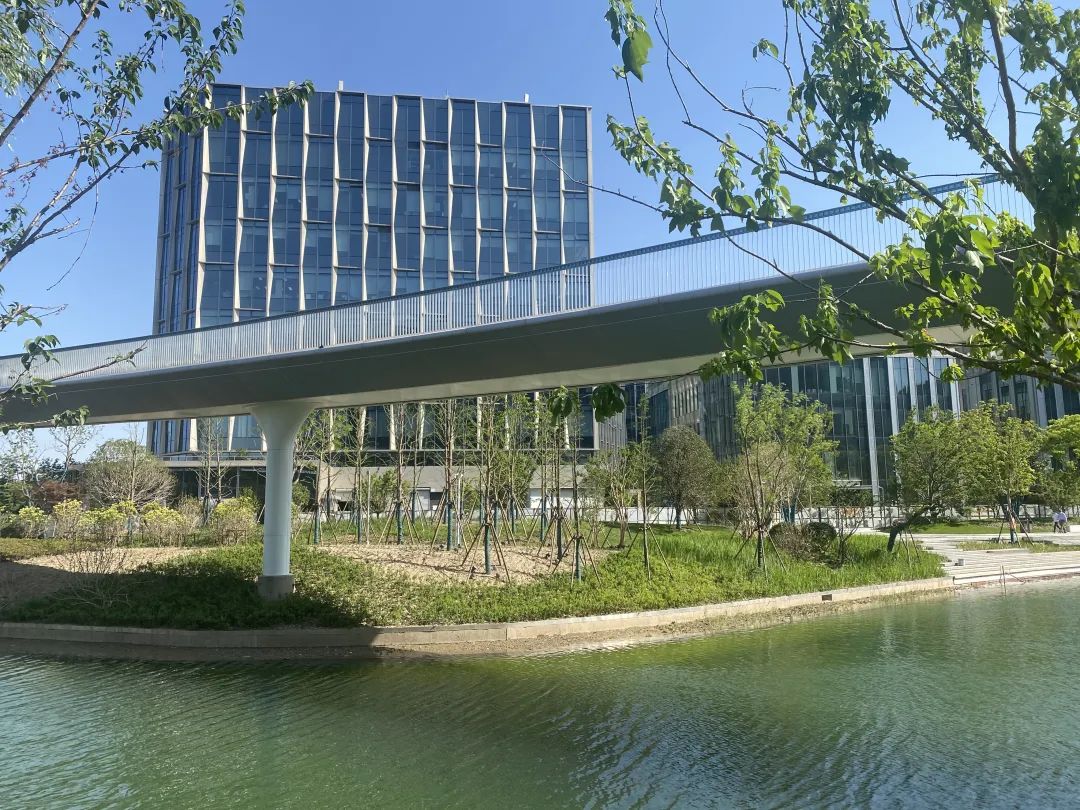 前几天,记者走在空中走廊上。近400米的蓝色步道横跨数字文路和数字景路。中间一个旋转楼梯连接走廊和地面,然后种植一些花草树木,放一些长椅和凳子,几乎就是高线公园的感觉!站在廊桥上看风景,有一种独特的味道。桥下蜿蜒的河流与海峡两岸高耸的现代商业建筑形成对比,在繁忙的工作之余享受城市的自然休闲。长度超过500米的景观水体,从西向东贯穿整个园区,连接闵行文化公园水域和横泾港。
