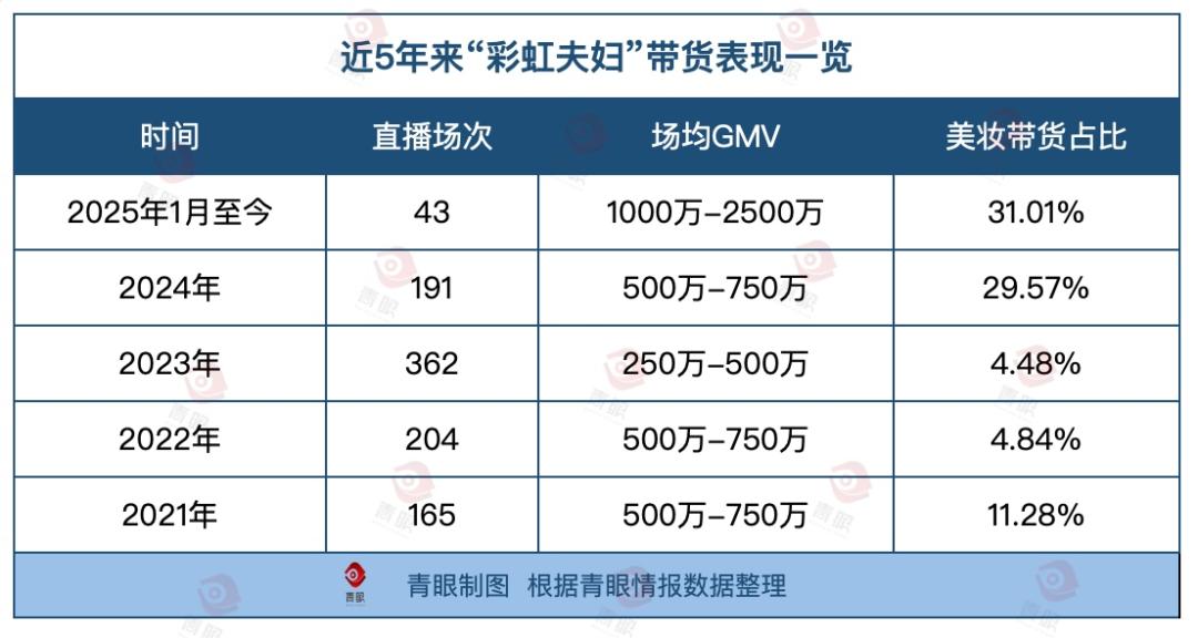 值得注意的是,早在2022年8月,“彩虹夫妇”就曾透露,每天带货2.3亿元,净利润超过400万元。根据青眼情报数据显示,自2025年以来,“彩虹夫妇”场均带货GMV为1000万-2500万元,其中美妆品类占30%以上,涉及珀莱雅、谷雨、蜜丝婷等多个美妆品牌。