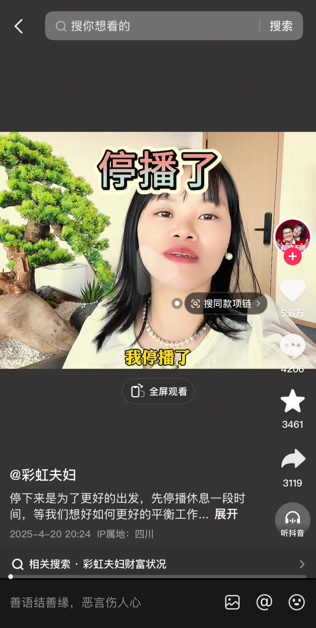 最近,“彩虹夫妇”在抖音上发布了一段视频,称“我停播了,今天(4月20日)是我停播的第四天。”视频中,“彩虹夫妇”还强调,在过去的五年里,已经有1000多场直播,每场比赛的平均时间超过8小时。长期高强度的工作已经导致严重的身体暴露。未来,我们将更加关注家庭生活和健康。“在考虑如何更好地平衡工作和身体之后,我们会考虑重新播出。”