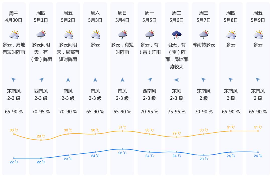 四月三十日,多云,局部阵雨短;气温22-30℃;东南风2-3级;相对湿度为65%-90%。