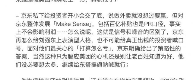 JD.COM的高管不可能不知道外卖很难赚钱,但现在他们宁愿赔钱也不愿意努力。网上的内部消息甚至透露,JD.COM私下告诉投资者,做外卖。 " 没想过要赢 " ,但是整个京东 " Make Sense " 。