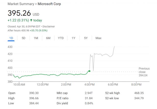 周三微软股价收盘报告 395.26 美元,盘后交易一度上涨超过一度。 9%。截至周三收盘,受更广泛的市场销售影响,该公司股价今年至今已下跌约 考虑到盘后大幅上涨,6%的微软股价从年初到现在已经转正。