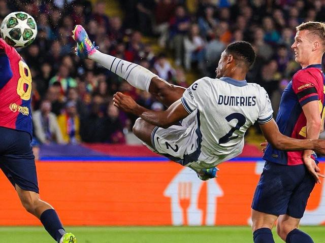 在冠军杯半决赛中,巴萨3-3国际进球对决,邓弗里斯两射一传场最佳。