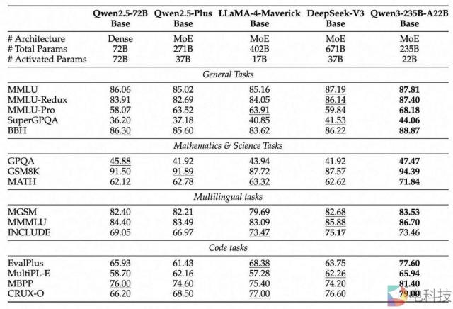 Qwen 团队中包含的基本模型评估说明,领先的基本模型 Llama 4、DeepSeek V3 以及现在的 Qwen 分数非常相似: