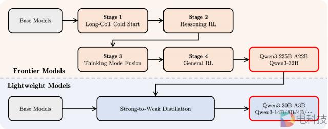 回到模型,除了性能和参数等最重要的相关信息外,外部也会关注。 Qwen3 如何训练系列模型?